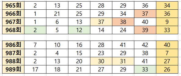 최근 968회, 989회는 이월한 초구위에 있는 단번이 10번대로 출현해줬습니다. 아래 (2번--12번), (7번---17번)